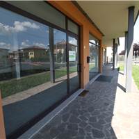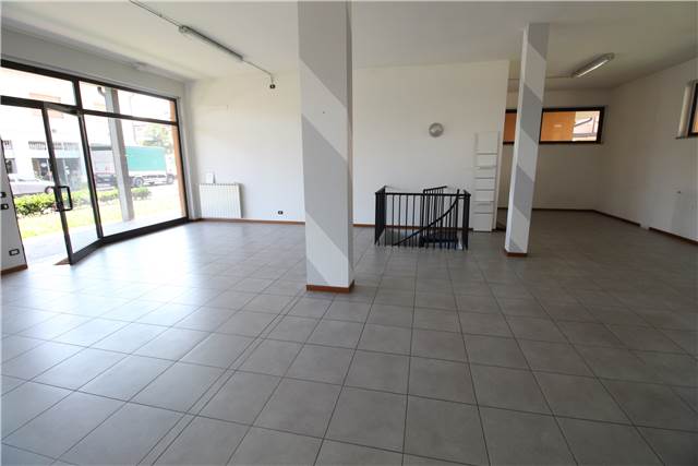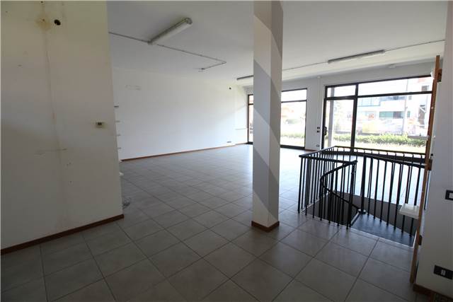 Ampio e luminoso locale open space, comodamente divisibile e dotato di due ampie vetrine fronte strada, disimpegno e bagno (allestito per consentire l'utilizzo alle persone affette da difficoltà motorie.) oltre ad un locale interrato comunicante tramite scala interna ad uso ripostiglio/locale di sgombero avente accesso diretto al vano autorimessa singola.